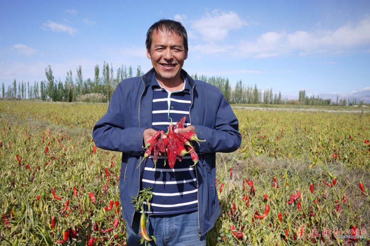 9月24日,青报君在新疆和静县看到,火红的辣椒像条长河一样“流淌”在天山脚下,一眼望不到边。这是一簇簇“青岛红”,因为这些辣椒的种子,都来自于青岛的胶州市。“今年的甜辣椒丰收了,村里的农民都很高兴!”吉里里笑着说。吉里里是和静县乃门莫敦镇包尔布呼村村主任,他家里40亩地原本种植小麦和玉米,每亩地的收入仅有300元左右。改种甜辣椒后,每亩地的纯收入提高到3000元,年收入从一万多元提高到了十几万元,是过去的十倍。“不少村民这几年靠种辣子买上了小轿车,盖上了新楼房。”吉里里激动地说。图为吉里里捧着丰收的红辣椒,脸上绽放着笑容。